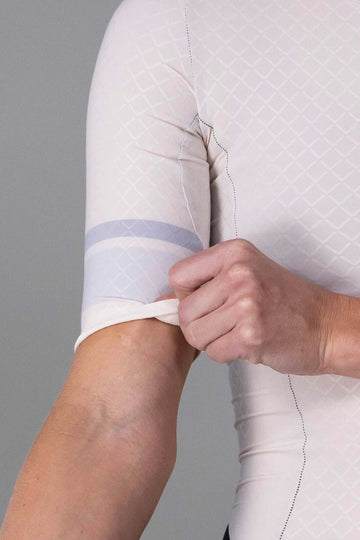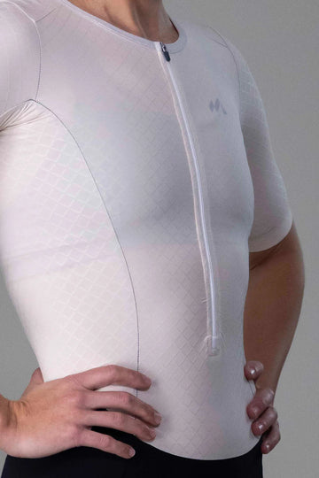 Aerodynamic woven diamond-pattern fabric on chest, back, sides, and sleeves.